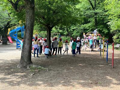 鬼ごっこをしたりドッヂボールをしたりグループごとに遊んでいます。ほどよい天気で気持ちが良いです。もう少ししたらお待ちかねのお弁当タイムです!
