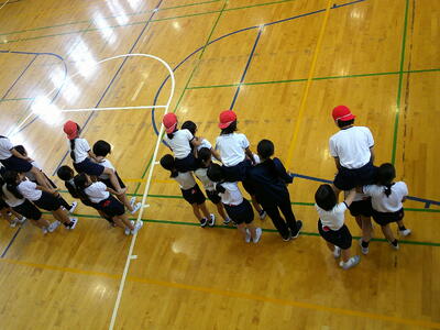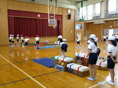 4年生は、跳び箱やマットを使ってサーキット運動です。