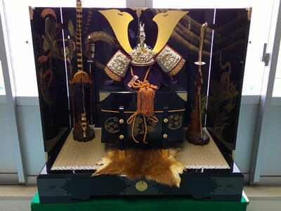 校内には、こいのぼりの掲示や兜の飾りが並んでいます。