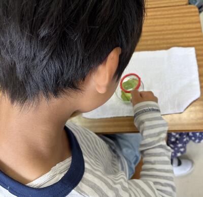 つくし学級 理科 カブトムシの幼虫をじっくり観察しています。