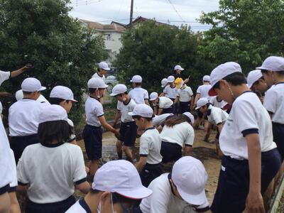昨日降った雨があがり、5年生は1時間目に田おこしを行いました。