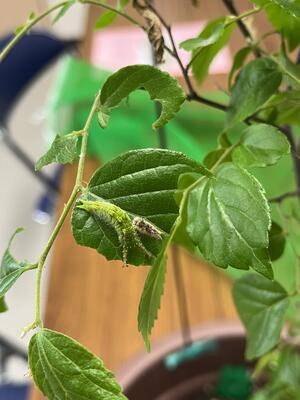 オオムラサキの幼虫の色が、茶色から緑に変わりました。エノキの葉っぱをたべて、スクスク成長しています。