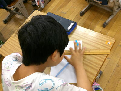2年生 算数 長さを真剣にはかっています。