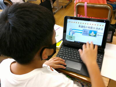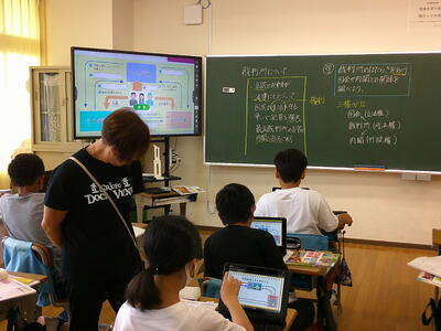 6年生 社会 三権分立についてタブレットを使って学習しています。