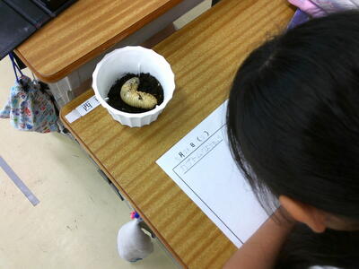 つくし学級 理科 カブトムシの幼虫をじっくり観察しています。