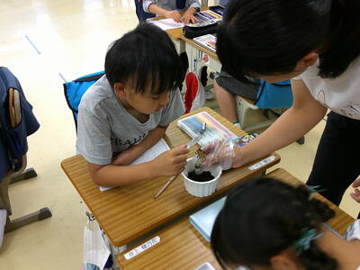 ゲストティーチャーの上妻先生に植え方を教わり、水の管理が大切だということも教わりました。