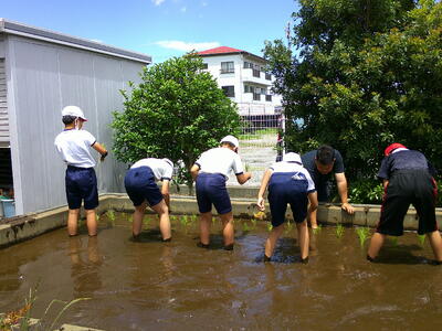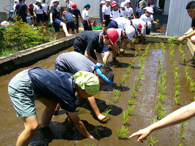 5年生が学校の田んぼで田植えを行いました。