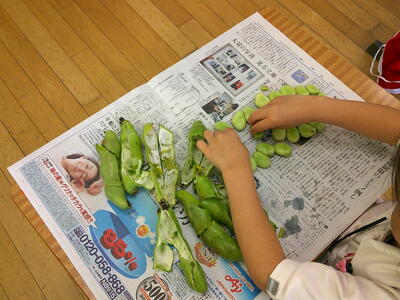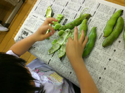 1年生が今日の給食で使う、そら豆のさやむきを体験しました。