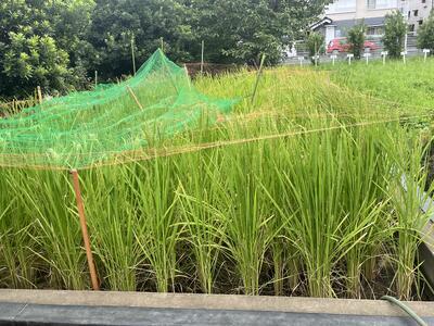 田んぼの稲に白い小さな花が咲き、穂が出始めています。