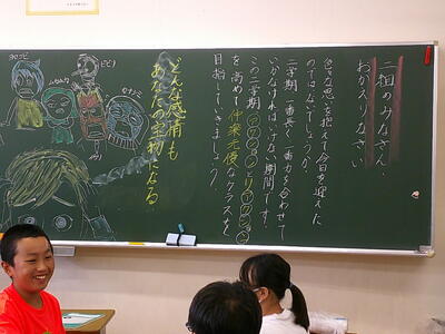 各教室、子供たちを迎える先生方の思いが黒板に書かれていました。