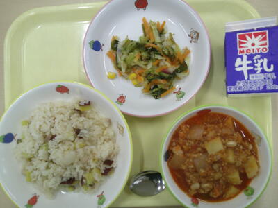 ごはん じゃがいもの鶏そぼろ煮 ビーンズごぼう みかん 牛乳