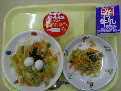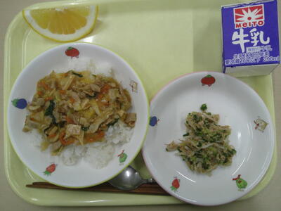 中華丼(麦ごはん) 野菜炒め ヨーグルト 牛乳