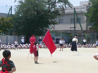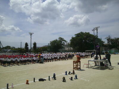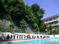今日は、6年生がプール開きを行いました。厳かな雰囲気の式では、お清めの塩をまき、安全を祈願してテープカットを行いました。国府台小の水泳指導のスタートです。