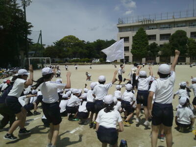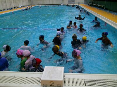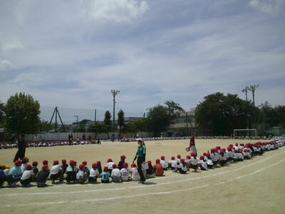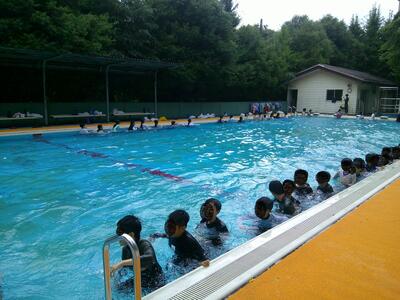 今日は、暑い一日でしたが、プールサイドで測定したWBGT(暑さ指数)は29のため、1年生は初めてのプールに入りました。ご存じ「じごくのシャワー!!」にドキドキ。冷たいシャワーに泣きそうな顔の子も…。プールの中に入るとみんな気持ちよさそうな顔をしていました。この季節しかできない水泳です。できる限り入れてあげたいものです。