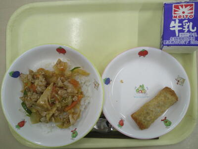 スパゲッティミートソース ツナポテト アップルパイ風春巻き 牛乳