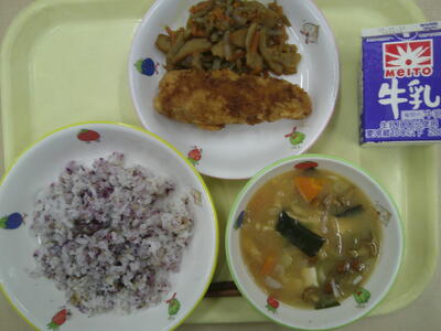 あじさいごはん 天ぷら(キス・かぼちゃ) 沢煮椀 牛乳
