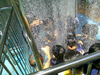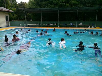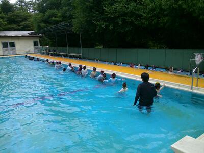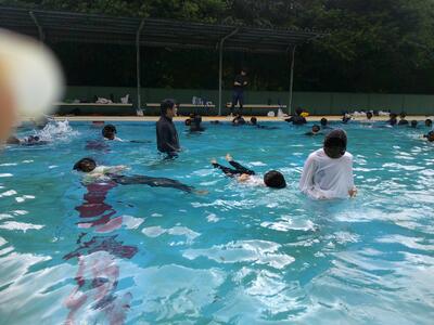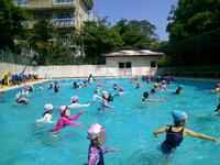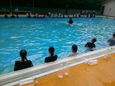 準備体操、シャワーを浴びてプールに入りました。今日は気温も水温も高く、絶好のプール日和です。1年ぶりのプールを満喫した6年生でした。