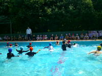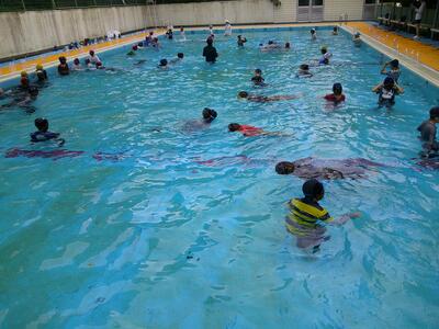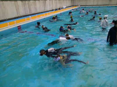 今日は6年生が、着衣泳を行いました。着衣泳は、服を着たまま水に落ちたら…を想定し、自分の身を守ることができるようにするための体験です。衣服を着ている状態での水の抵抗や浮力を感じ、ペットボトルなどを活用して浮かぶなど冷静に状況を判断し行動できるようになることが目的です。まずは、水に落ちないように気をつけていきましょう。