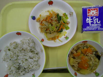 じゃこ菜飯 肉じゃが 野菜炒め 牛乳