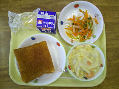 きなこトースト マカロニのクリーム煮 スティックサラダ 冷凍りんご 牛乳