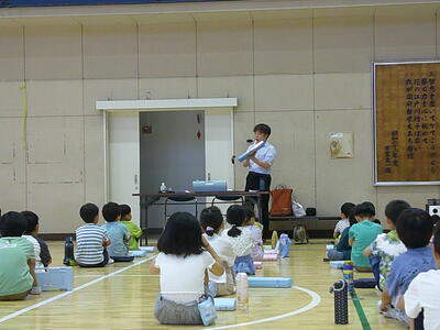 今回は木管五重奏&ピアノ演奏を行う「ドレミファクトリー」の方々をお招きしての公演です。木管五重奏とは、フルート、オーボエ、クラリネット、ファゴットの4種類の木管楽器に、ホルンを加えた5本の管楽器によるアンサンブル(合奏)です。楽器や曲のわかりやすい説明や、迫力ある演奏に子どもたちは聞きほれていました。