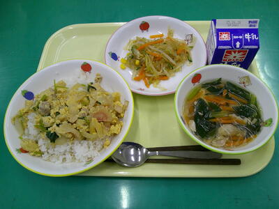 親子丼(麦ごはん) 寒天のサラダ 春雨スープ 牛乳