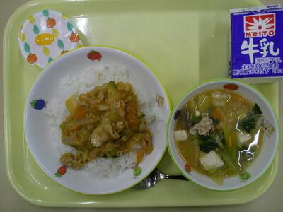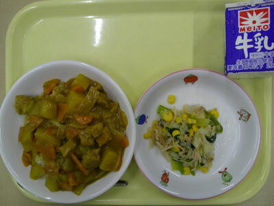 夏野菜カレー(麦ごはん) キャベツとベーコンのソテー 牛乳