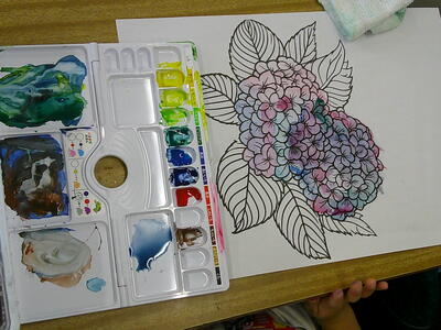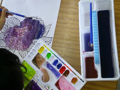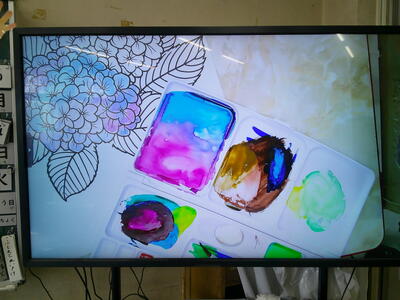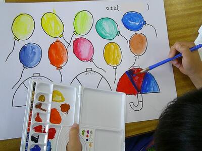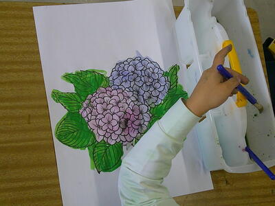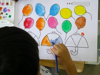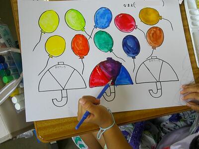1年生が絵の具を使っての水彩にチャレンジです。色を混ぜ、筆に水を含ませて色を付けていきます。「〇と△を混ぜると◇になる」色の混ぜ方を工夫すると友だちとは違った色になります。個性豊かな作品が出来上がります。