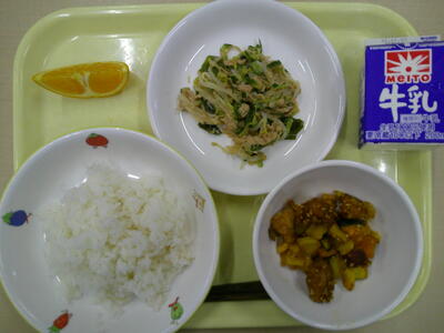 ごはん 豚肉とサツマイモの甘辛炒め ゴマ酢和え オレンジ 牛乳