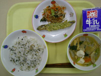 わかめごはん シシャモの磯辺揚げ もやしの和え物 田舎汁 牛乳
