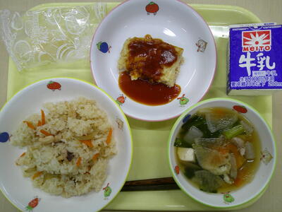 ツナピラフ フライドチキン マセドアンサラダ フルーツ白玉 牛乳