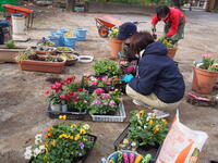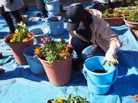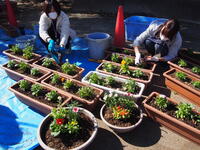 今回は寄せ植えを行いました。プランターや丸鉢など30個ほどを作っていただきました。