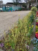 主に花の手入れを。2週間後の卒業式に、菜の花やプランターの花々がベストな状態になるようにと、最後の仕上げをしました。福池さんや花ボランティアさんの計画通り、1年生が植えた色とりどりのチューリップと花ボランティアさんがお世話をした花々が、卒業に合わせて満開となりました。きっと、卒業生たちの記念写真を彩ったことでしょう。