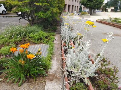 花壇の中で密になったコスモスの苗を間引きし、用務員さんが発芽させたヒマワリの苗を移殖しました。また、花の時期が終わったオルレアや雑草を取り除き、密になっていたキバナコスモスの苗も分散させ、バラの周りもすっきり!!バラの時期が終わると、オレンジ色のキバナコスモスが、子供達の登下校を見守ることでしょう。