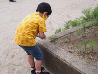 切り落としたコスモスの花を手に取り、「ここに植えようっと。」と、花壇に植えていました。