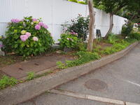 デイサービス沿いの花壇には垣根があったのですが、それを伐採し、土を掘り起こしてアジサイを。数年後には、アジサイロードとなるイメージで移植しました。