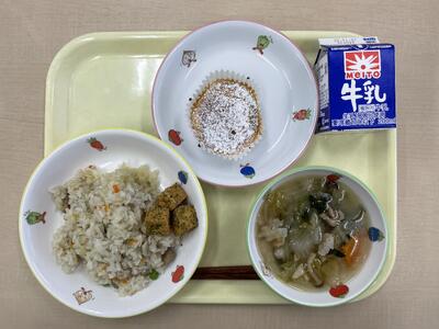 吹き寄せご飯 カリカリから揚げ ほうれん草の辛し和え わかめのすまし汁 牛乳 です。