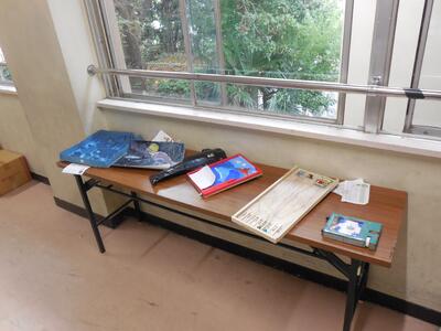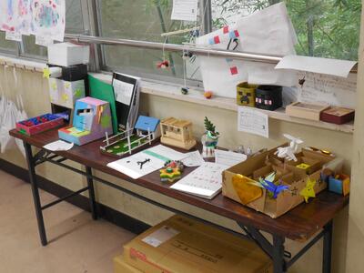 夏休みにチャレンジして、コンクール等に出品していない作品が廊下に展示されています。賞はつきませんが、どれも力作ぞろいです。みんなの努力作品なので、さわって壊さないようにしてくださいね。(写真は3年生です)