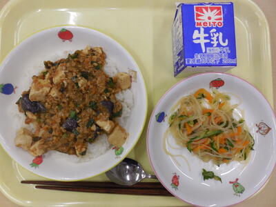 マーボーなす丼(麦ごはん) 春雨サラダ 牛乳