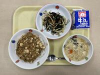 マーボ丼 パリパリヒジキサラダ きくらげと卵のスープ 牛乳 です。