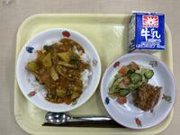こうのとりカレーライス(麦入りごはん) スパイシーチキン フレンチトマトサラダ 牛乳 です。