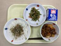 ごはん サクラエビのふりかけ 酢豚 きゅうりと茎わかめの辛味付け 牛乳 です。