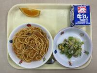 ミートソーススパゲッティ カリカリベーコンサラダ オレンジ 牛乳 です。