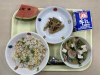 三食そぼろご飯 かみかみごぼう 春雨スープ スイカ 牛乳 です。