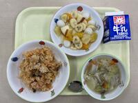 ハムピラフ お豆のスープ フルーツ白玉 牛乳 です。
