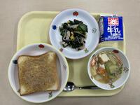 セサミトースト 洋風煮込み ハムとわかめのサラダ 牛乳 です。