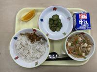 フレッシュトマトのハヤシライス 春野菜のツナサラダ 果物ゼリー 牛乳 です。