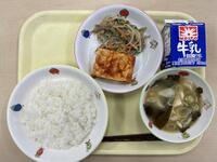 わかめごはん とりのから揚げ 色とりどりゴマサラダ すまし汁 牛乳 です。