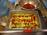 各クラスの食缶に卵焼きを入れ、ケチャップソースをかけます