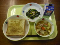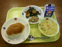 こめこのコーンチャウダーは、パンとの相性が良く、パンをくり抜いてチャウダーを入れたり、パンをちぎってチャウダーにつけたりと、工夫して食べている様子がうかがえました。いんげん豆を苦手とする児童がいましたが、一口頑張って食べてくれた児童がいました。「すごいね!」「頑張って、えらいね!」と声掛けをして席の周りのみんなで祝福しました。少しずつでも、苦手な食べ物を克服できることは本当に素晴らしいことです。